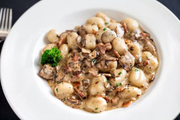 Potato gnocchi, cremini mushrooms, pancetta bacon in a gorgonzola cream sauce.